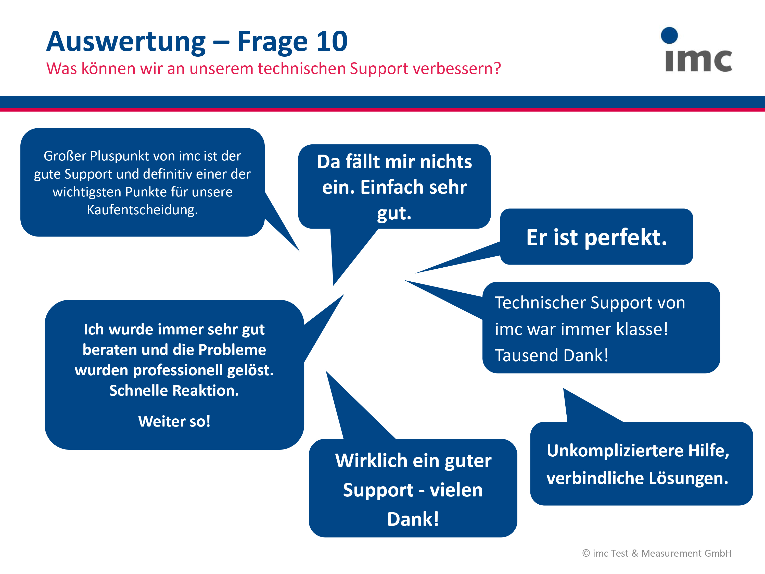 Besondere Pluspunkte in der Umfrage konnte die imc Hotline sammeln. Es wurde deutlich, dass der persönliche Kontakt zu unseren Vertriebsexperten und Ingenieuren im Kundensupport für unsere Kunden sehr wichtig ist. Mit verlässlichen und fundierten Informationen und einer kompetenten Unterstützung bei Problemen sorgt die Hotline für eine hohe Zufriedenheit bei den Befragten.