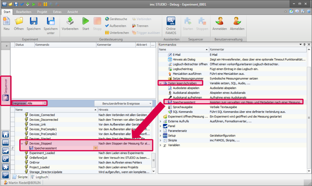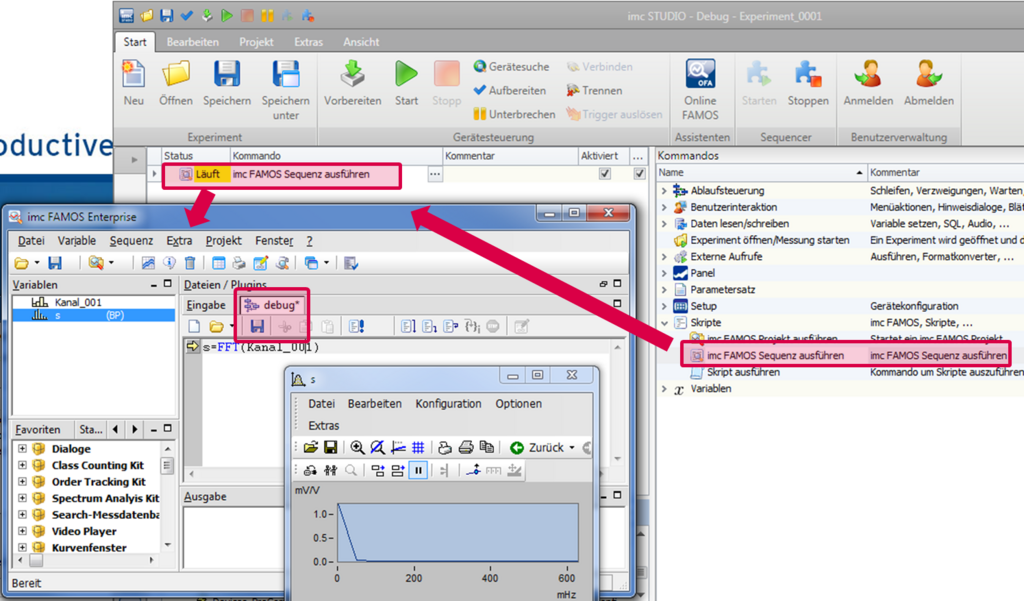 L'intégration d'imc FAMOS pour automatiser l'analyse des données a été amélioré. A l'aide du nouveau"Mode Debug", il est possible de dérouler les séquences étape par étape, directement avec les dernières données de mesure. Cela signifie que tous les résultats intermédiaires sont disponibles pour le traitement et la visualisation, rendant ainsi beaucoup plus facile l'examen et le développement des algorithmes d'analyse.