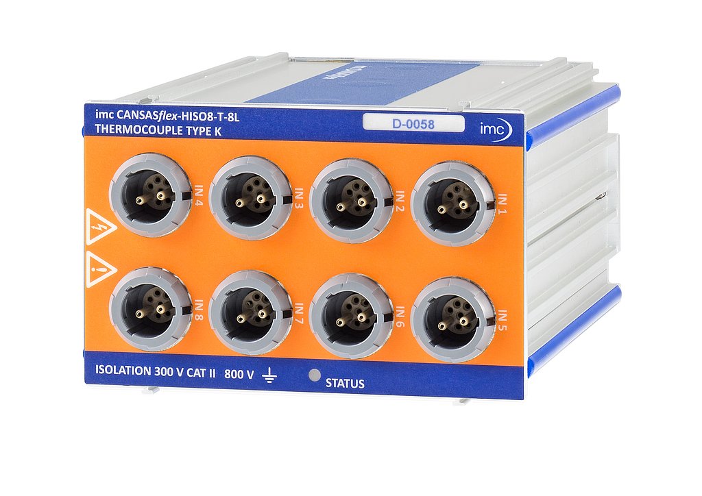 Le module de mesure HT imc CANSASflex-HISO8-T permet la mesure sûre et précise de huit thermocouples (type K) à des niveaux de mode commun allant jusqu'à 800 V. Il est particulièrement adapté aux applications dans le domaine de l'électromobilité.