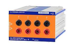 Le module de mesure HT CANBus imc CANSASflex-HISO-HV4 offre quatre entrées isolées pour mesurer des tensions différentielles élevées jusqu'à 800 V. Par exemple, les hautes tensions peuvent être mesurées au niveau de la batterie et des convertisseurs de puissance.