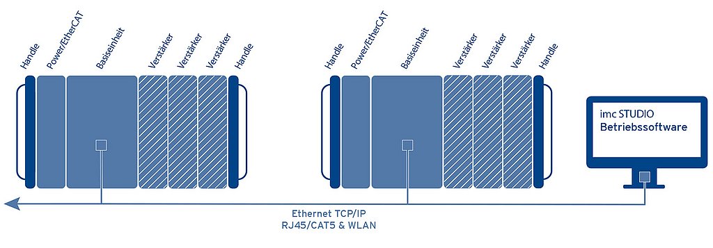 Pour des mesures étendues avec des centaines ou des milliers de canaux, plusieurs CRONOS-XT imc, ainsi que tous les autres appareils de mesure imc, peuvent être utilisés ensemble comme un seul système. Les appareils sont mis en réseau par Ethernet et synchronisés par DCF77, IRIG-B, GPS ou PTP. Les données sont stockées de manière autonome dans les appareils et/ou transférées vers un NAS ou un PC par le biais d'un streaming réseau.