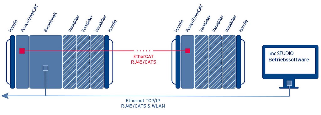 En plus de la conception modulaire en tant que système centralisé, imc CRONOS-XT peut également être installé dans une topologie décentralisée. Cela permet de placer les amplificateurs de mesure à proximité du capteur afin de réduire au minimum la longueur des câbles sensibles et coûteux. La mise en réseau s'effectue via le bus système imc basé sur EtherCAT. Toutes les données sont transmises de manière synchrone dans l'unité de base.