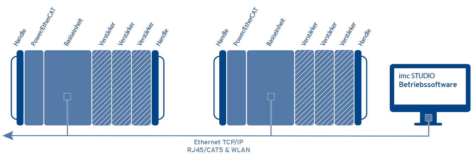 En plus de la conception modulaire en tant que système centralisé, imc CRONOS-XT peut également être installé dans une topologie décentralisée. Cela permet de placer les amplificateurs de mesure à proximité du capteur afin de réduire au minimum la longueur des câbles sensibles et coûteux. La mise en réseau s'effectue via le bus système imc basé sur EtherCAT. Toutes les données sont transmises de manière synchrone dans l'unité de base.