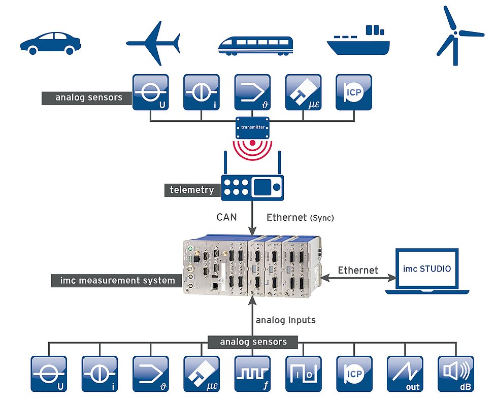 imc vous propose des systèmes modernes de télémesure pour les tâches les plus variées de mesure sur des composants rotatifs ou des composants mobiles : il peut ainsi s'agir de la surveillance monovoie du couple d'un arbre rotatif, de la mesure multivoies de jauges et de la température d'un essieu ferroviaire, ou encore de la mesure sans contact de la puissance motrice d'un véhicule dans un environnement plus rude. Les parties électroniques de conditionnement sont disponibles pour une grande variété de capteurs, comme p.ex. les jauges (quart de pont, demi-pont et pont complet), les thermocouples et PT100/1000 ainsi que les capteurs IEPE et les signaux de tension.